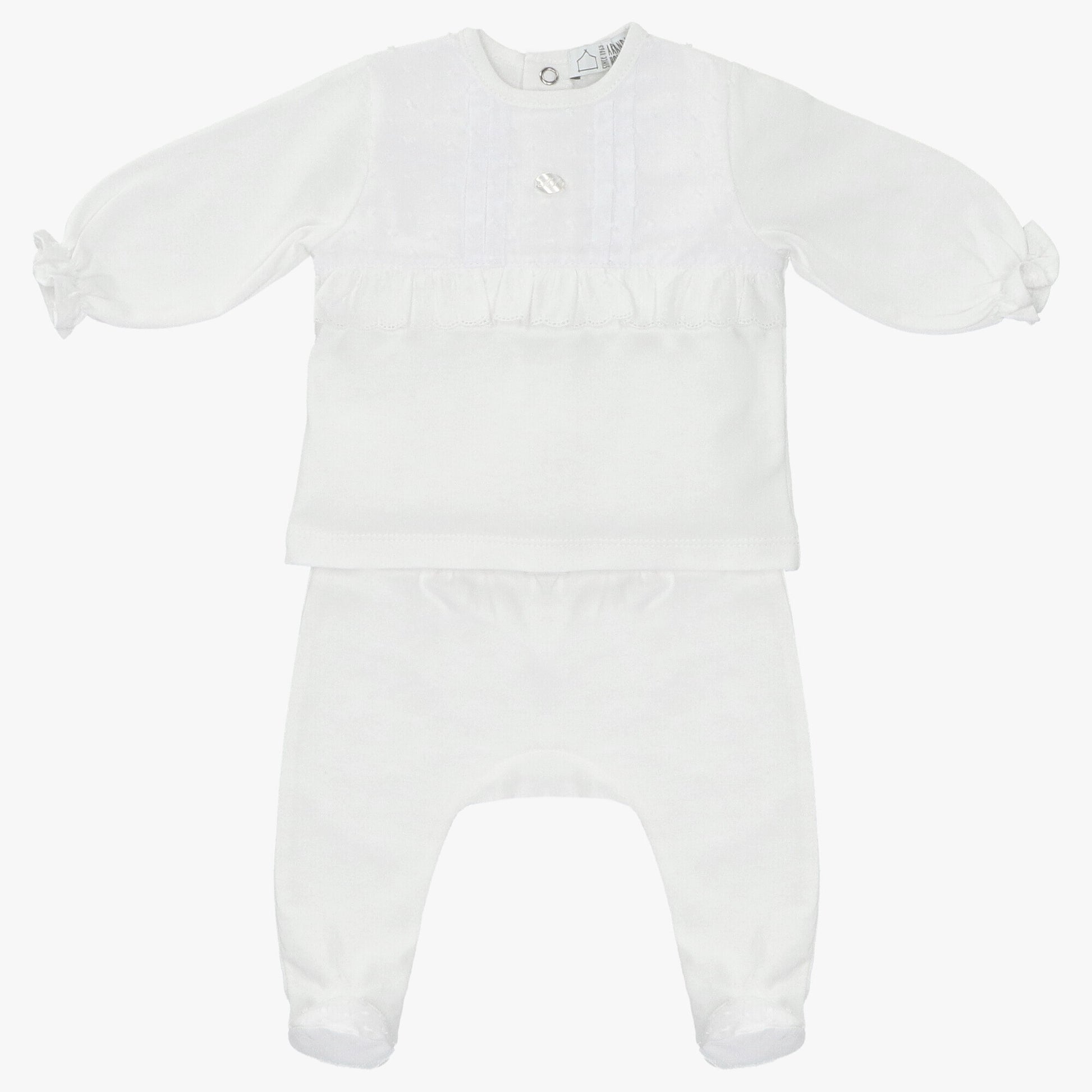 white ruffle shirt with footie pant 2 piece set